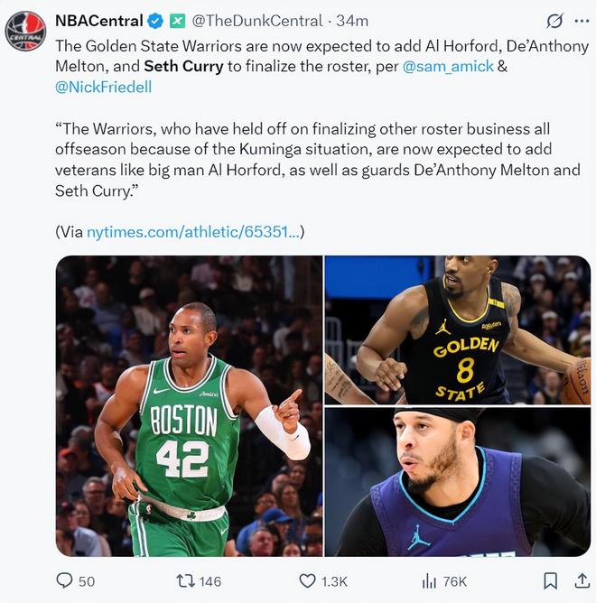 随后NBA两位记者萨姆-阿米克、尼克-弗尼德尔联合报道,在勇士队续约库明加后球队将连续签下霍福德、梅尔顿、小库里三人,这样勇士队就完成了他们的15人大名单。