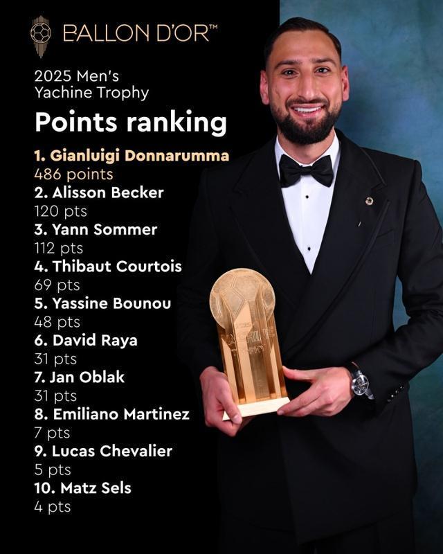 直播吧09月27日讯 2025年雅辛奖排名详情公布,荣获该奖项的意大利门将多纳鲁马以486分断层领先,第2名阿利森获得120分,第3名索默获得112分。